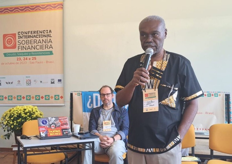 Ao microfone o professor Camille Chalmers, da Plataforma Haitiana pela Defesa de um Desenvolvimento Alternativo (PAPDA).